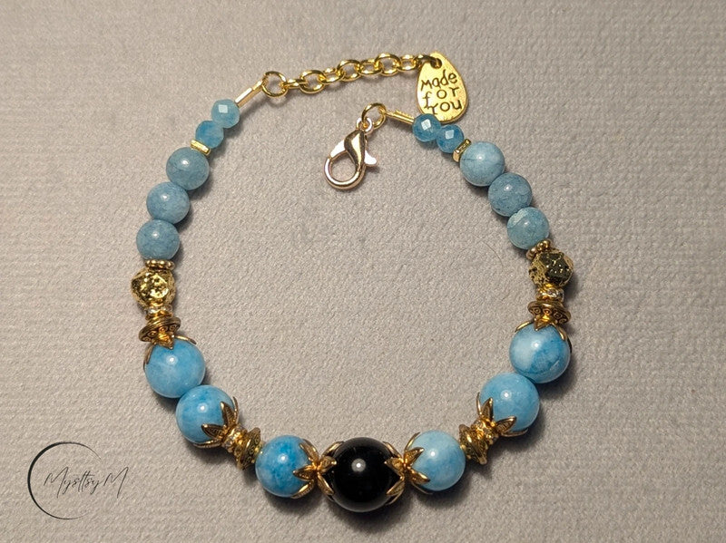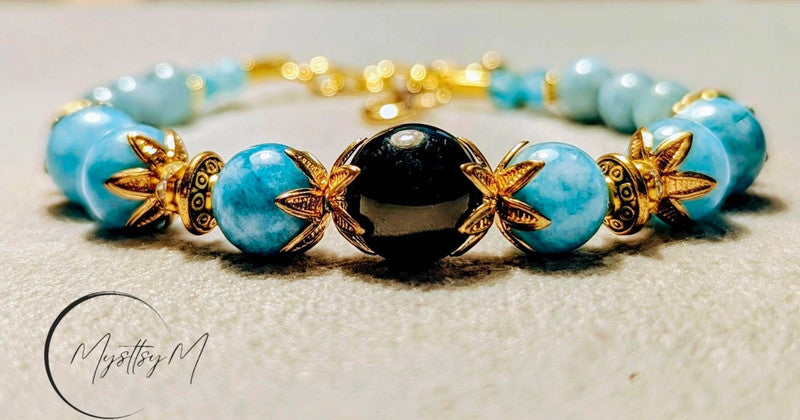 Ce bracelet unique allie l'élégance des perles naturelles et leurs bienfaits. Aigue-marine : Apaise et favorise la communication. Jade Bleu : Apporte la sérénité et l'équilibre émotionnel. Calcédoine Bleue : Encourage la bienveillance et la paix intérieure. Obsidienne : Pierre de protection, elle aide à éloigner les énergies négatives. Un bijou à la fois esthétique et porteur de sens.