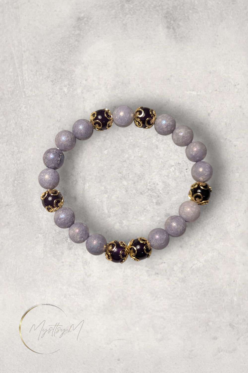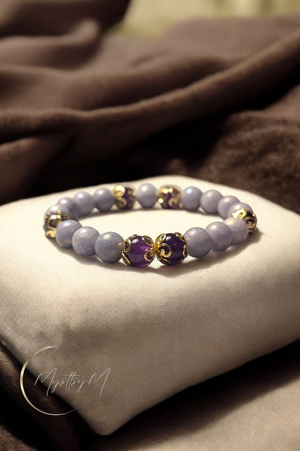 Sublimez votre poignet avec ce bracelet artisanal unique, une véritable ode à la sérénité et à l'harmonie. Confectionné à la main, il associe la douceur de l'Angélite, connue pour ses vertus apaisantes, à la puissance protectrice de l'Améthyste, symbole de sagesse et de spiritualité. Chaque perle est soigneusement sélectionnée pour sa qualité, et le bracelet est orné d'élégantes entretoises en acier inoxydable doré, non seulement durables et hypoallergéniques, mais qui ajoutent également une touche d'éclat et de sophistication. Ce bijou est idéal pour quiconque cherche à allier style et bien-être. C'est le cadeau parfait à offrir ou à s'offrir, une pièce qui saura apporter calme et élégance au quotidien.