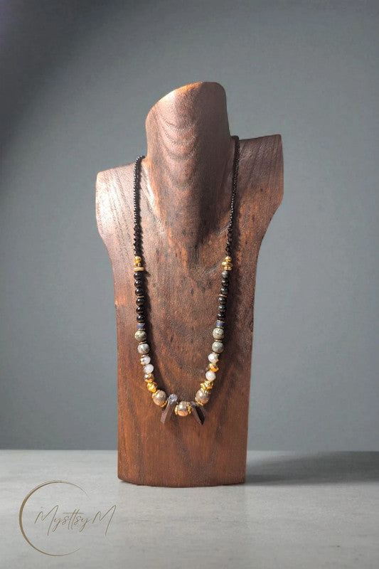 Ce collier est une véritable ode à la puissance de la terre. La pyrite, ses trois perles centrale, attire le regard avec ses éclats dorés, symbolisant l'abondance et la protection. Elle est sublimée par le cristal de quartz qui amplifie les énergies, la serpentine qui favorise la sérénité et l'obsidienne noire qui agit comme un bouclier contre les énergies négatives. Cet assemblage harmonieux de pierres naturelles n'est pas seulement un bijou, c'est un talisman qui allie force, clarté et protection. Parfait pour celles et ceux qui cherchent à s'ancrer et à retrouver un équilibre intérieur.