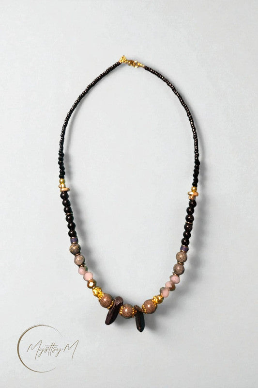 Pyrite, cristal de quartz, serpentine, obsidienne noir, perle de rocaille, perles doré.